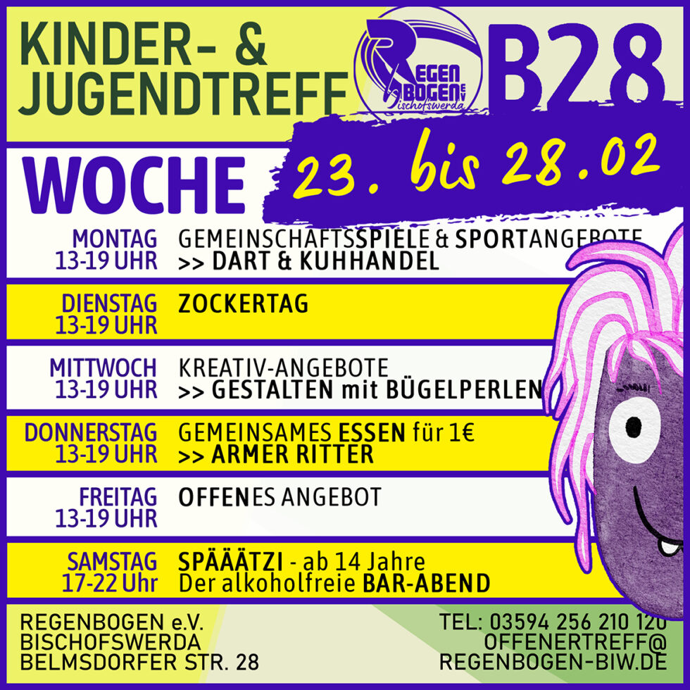 FERIENWOCHE 1: 09.02. bis 13.02.2026 B28_2026-02-00_Anmeldung Winterferien B28_2026-02-16_Anmeldung Faschingsparty >>> Montag, 09.02.2026 AUSFLUG: Eislaufen in der JOYNEXT Arena Dresden Wir fahren mit den Kindern und Jugendlichen per Bahn nach Dresden,...