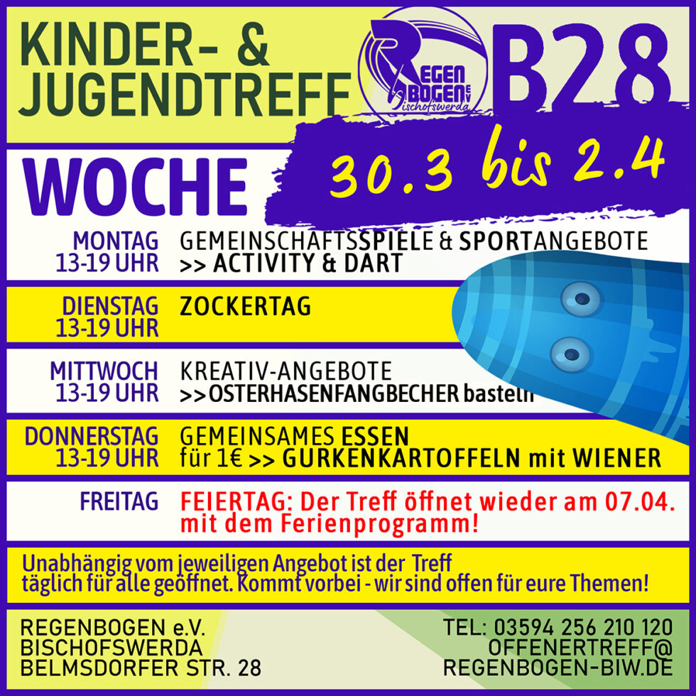 >> FERIENPLAN zum Download: B28_2025-10-00_Herbsferien_Plan >> ANMELDEFORMULAR zum Download: B28_2025-10-00_Herbstferien_Anmeldeformular FERIENWOCHE 1: 06.10. bis 10.10. Kosten für die gesamte Woche inkl. Essen: EUR 33,00...