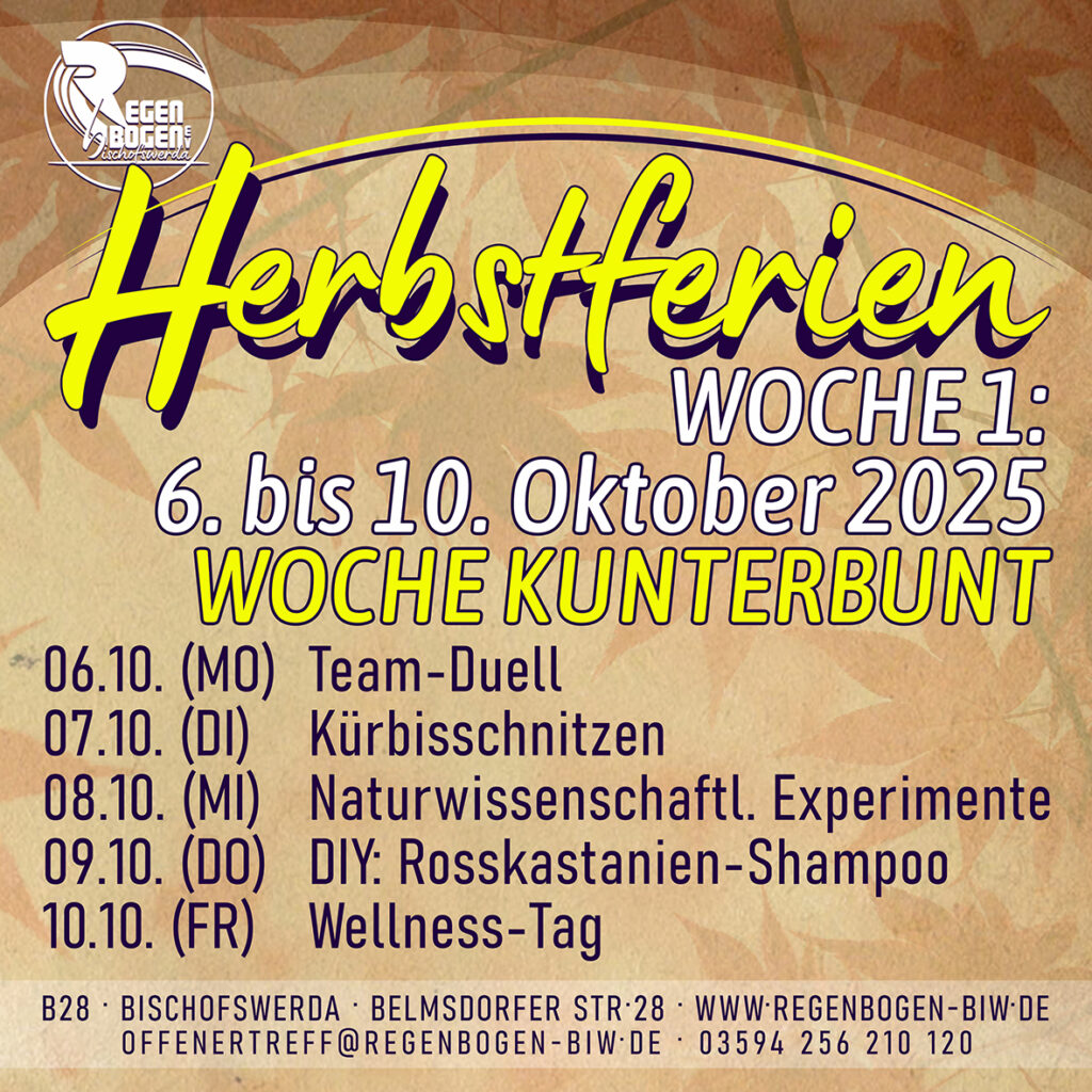 >> FERIENPLAN zum Download: B28_2025-10-00_Herbsferien_Plan >> ANMELDEFORMULAR zum Download: B28_2025-10-00_Herbstferien_Anmeldeformular Kosten für die gesamte Woche inkl. Essen: EUR 33,00 >> Montag, 06.10.: Team-Duell im B28 (10-16 Uhr) Der … Herbstferien 2025: Ferienwoche 1 (06.10.-10.10.) weiterlesen
