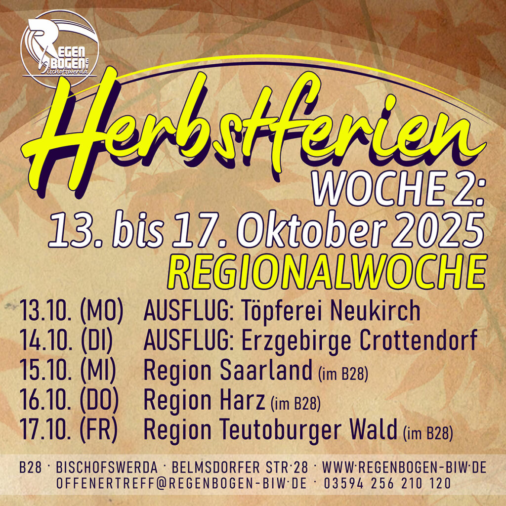 >> FERIENPLAN zum Download: B28_2025-10-00_Herbsferien_Plan >> ANMELDEFORMULAR zum Download: B28_2025-10-00_Herbstferien_Anmeldeformular Kosten für die gesamte Woche inkl. Essen: EUR 48,00 In der zweiten Ferienwoche begeben wir uns zum dritten und … Herbstferien 2025: Ferienwoche 2 (13.10.-17.10.) weiterlesen