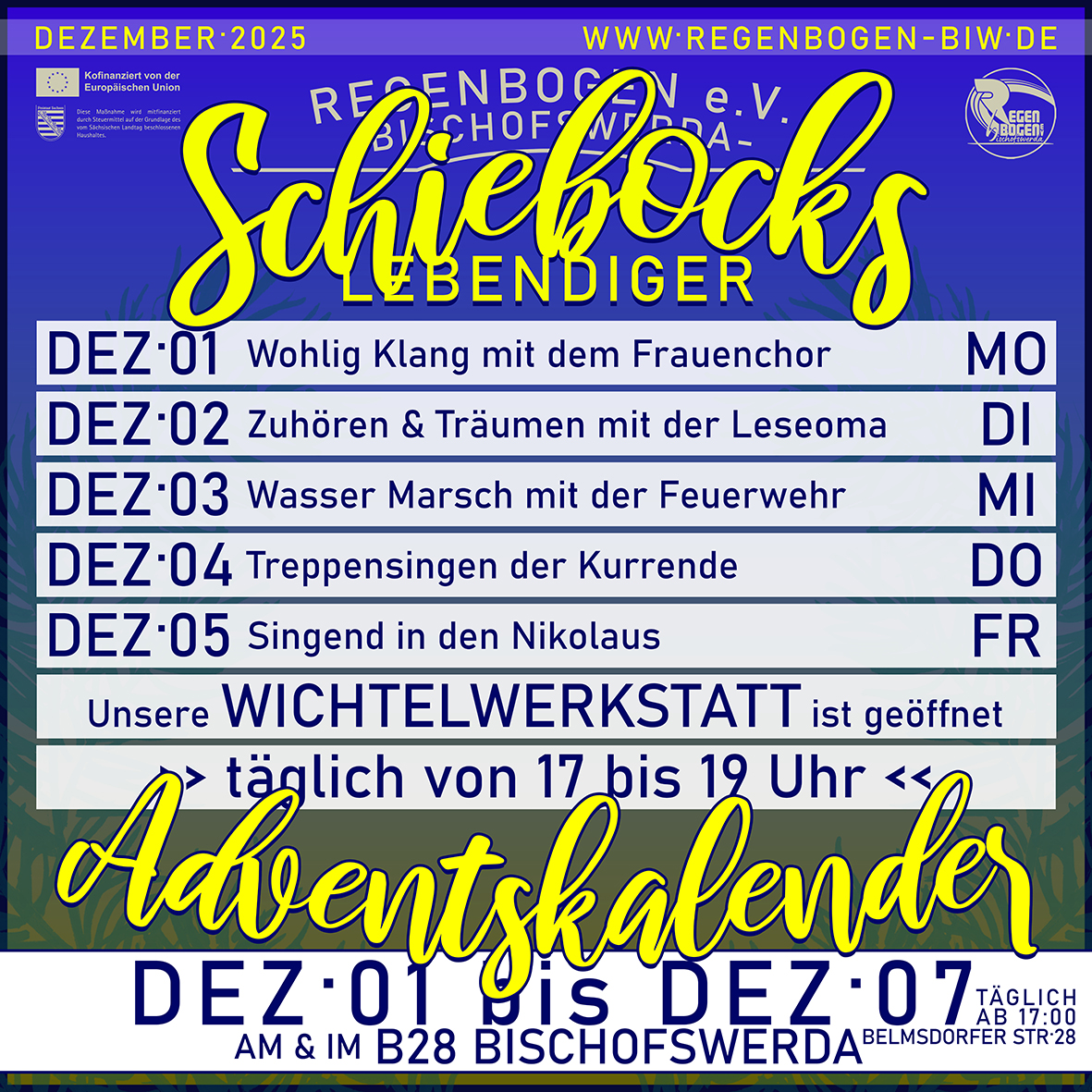 auch in diesem Jahr, wenn auch in anderer Form als gewohnt, gibt es einen Lebendigen Adventskalender! Hierzu lädt der Regenbogen e. V. in der Zeit vom 01. bis zum 21.12. fast jeden Tag ins B28, Belmsdorfer Straße 28, wo im und am Haus eine Aktion das jeweilige Kalendertürchen schmückt, das ab 17 Uhr bei klassischer Weihnachtsmarkt-Verköstigung geöffnet wird.