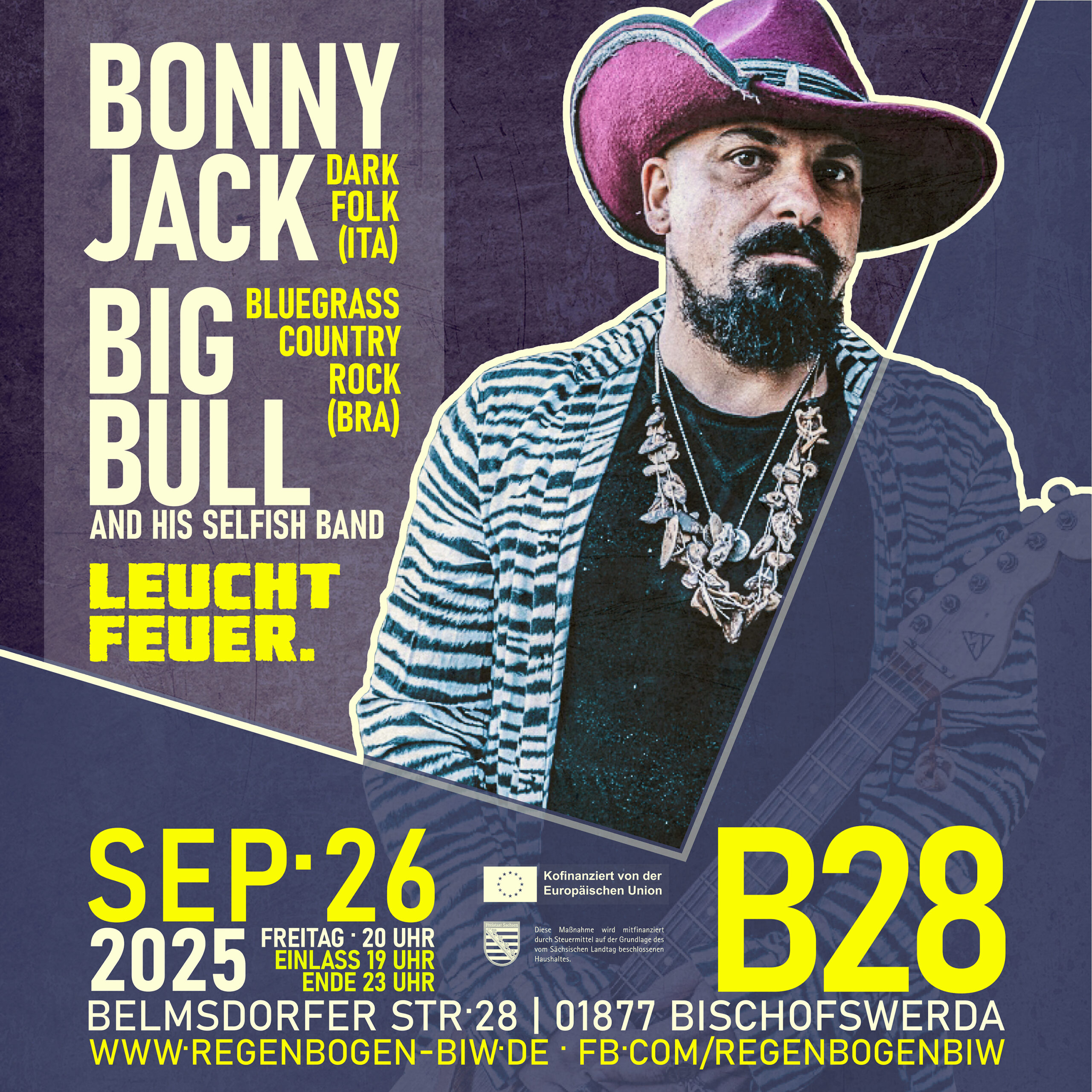 Zwei dieser Solo-Geschwader durchqueren im Herbst Europa und docken im B28 an. Der Brasilianer Allisson Santos, der seit 2020 nichts anderes mehr macht, als dauerhaft zu touren, duelliert sich unter seinem Moniker BIG BULL AND HIS SELFISH BAND jeden Abend mit dem Italiener BONNY JACK. BIG BULL, vermutlich nicht der lateinamerikanische Halbblutbruder von Sitting Bull, kann zum Glück seine dunkle Vergangenheit kaum verleugnen, so stark steckt ihm der Rock’n’Roll in den Gliedern – rau, schmutzig, ergreifend.