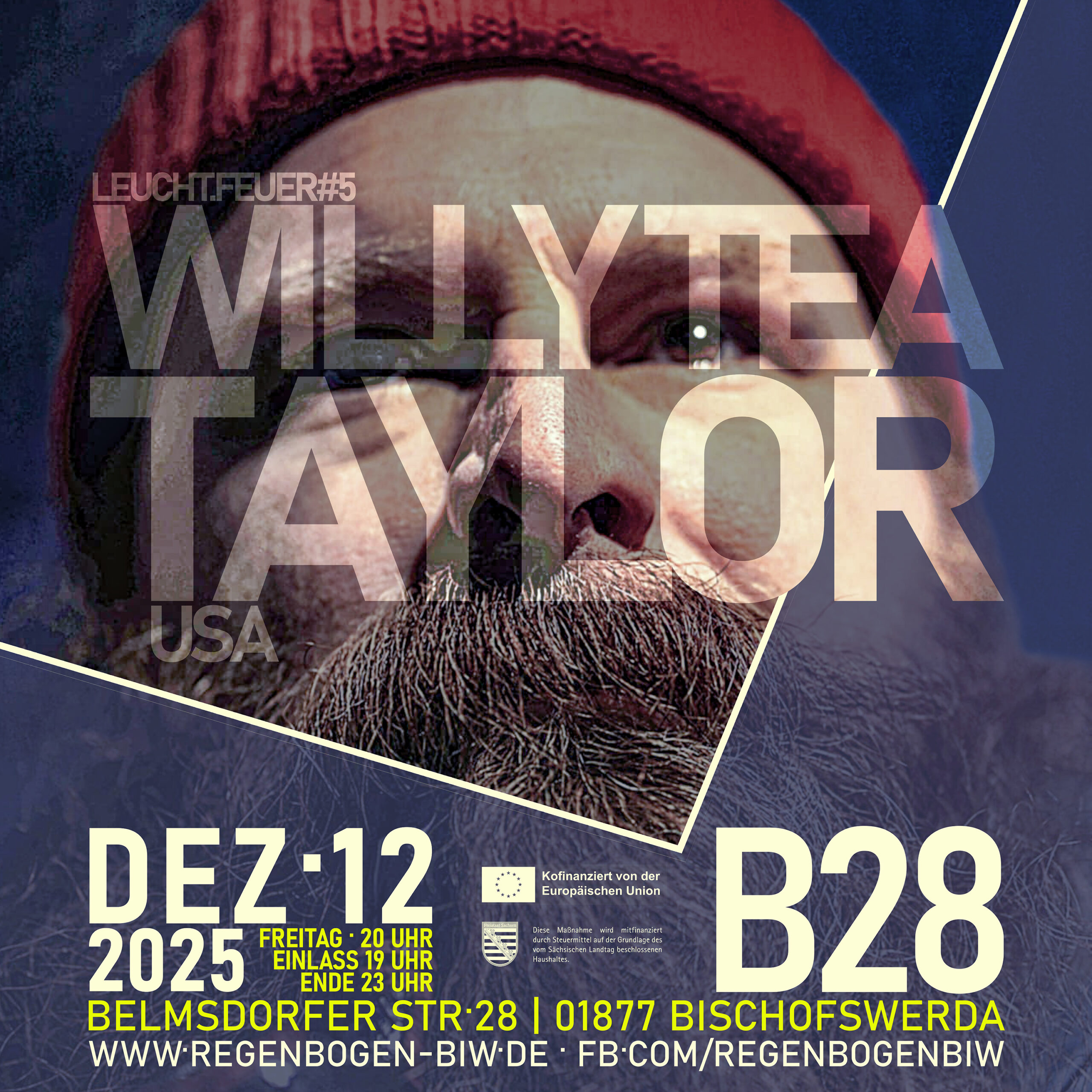 Die Leucht.Feuer des B28, die Musikveranstaltungen in wohliger Atmosphäre, bleiben trotz entschleunigtem Rahmen spannend und sind mit Themen besetzt, deren Eigenheiten eher anziehender Natur sind: Im Dezember auf seiner Tour durch Europa wird ein weiteres dieser Originale aus den Staaten im B28 habhaft: Willy Tea Taylor – viel Haar im Gesicht, schlicht mit seiner Gitarre bewaffnet, erdig im Habitus und eindringlich in der Umsetzung.