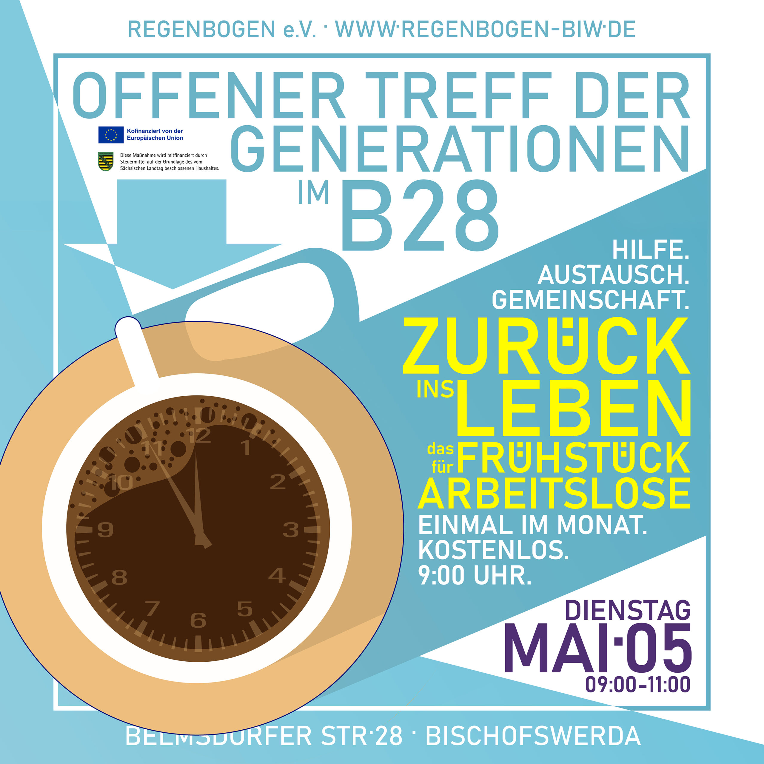 Um dieser Situation zu begegnen, bietet das B28 in Zukunft wieder ein Frühstück für Arbeitslose an, vollkommen kostenlos. Gezielt einmal im Monat, an einem Dienstag, zwischen 9 und 11 Uhr, steht unser Haus denen offen, die sich nach Gemeinschaft sehnen, sich gern mit Menschen austauschen möchten, die von ähnlichen Sorgen geplagt werden, und auch Hilfe in der aktuellen Situation zu schätzen wissen. Manchmal kommt ein guter Rat, wenn man ihn gar nicht erwartet. Und manchmal reicht ein Gespräch, um wieder Hoffnung zu schöpfen und Ideen zu entwickeln.