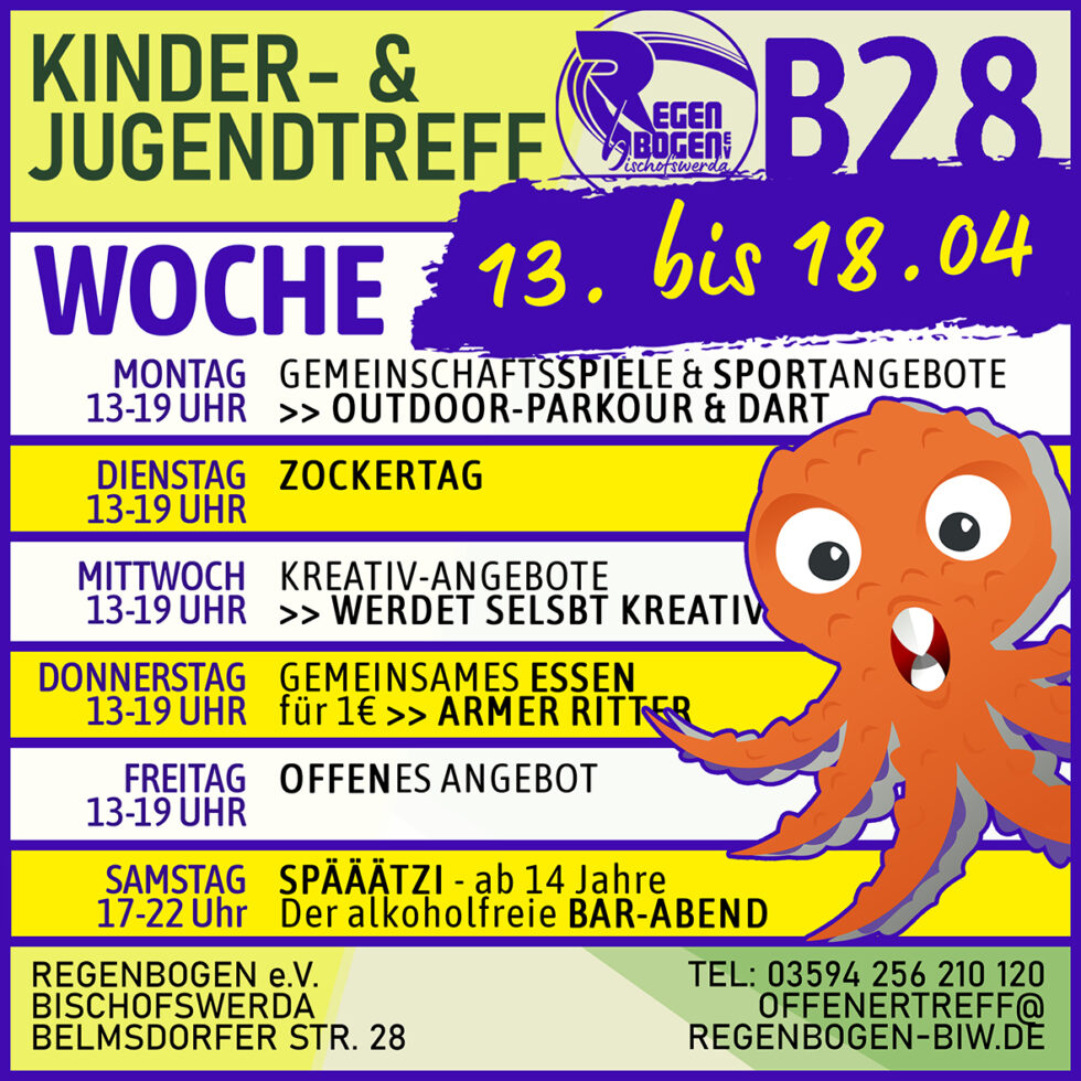 13 April KW16 im Kinder- und JugendtreffDatum: Apr. 13 - 18, 2026Uhrzeit: 13:00 - 19:00Veranstaltungsort: Offener Treff B28Kategorie: Ambulante Hilfen, Jugendclub, Mobile Arbeit, Offener Treff der Generationen, Schulsozialarbeitmehr Infos