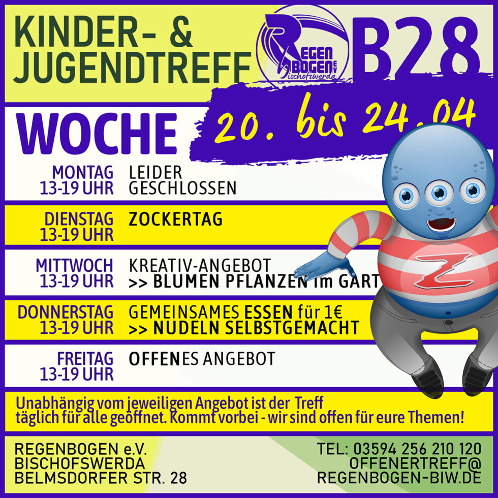 20 April KW17 im Kinder- und JugendtreffDatum: Apr. 20 - 24, 2026Uhrzeit: 13:00 - 19:00Veranstaltungsort: Offener Treff B28Kategorie: Ambulante Hilfen, Jugendclub, Mobile Arbeit, Offener Treff der Generationen, Schulsozialarbeitmehr Infos